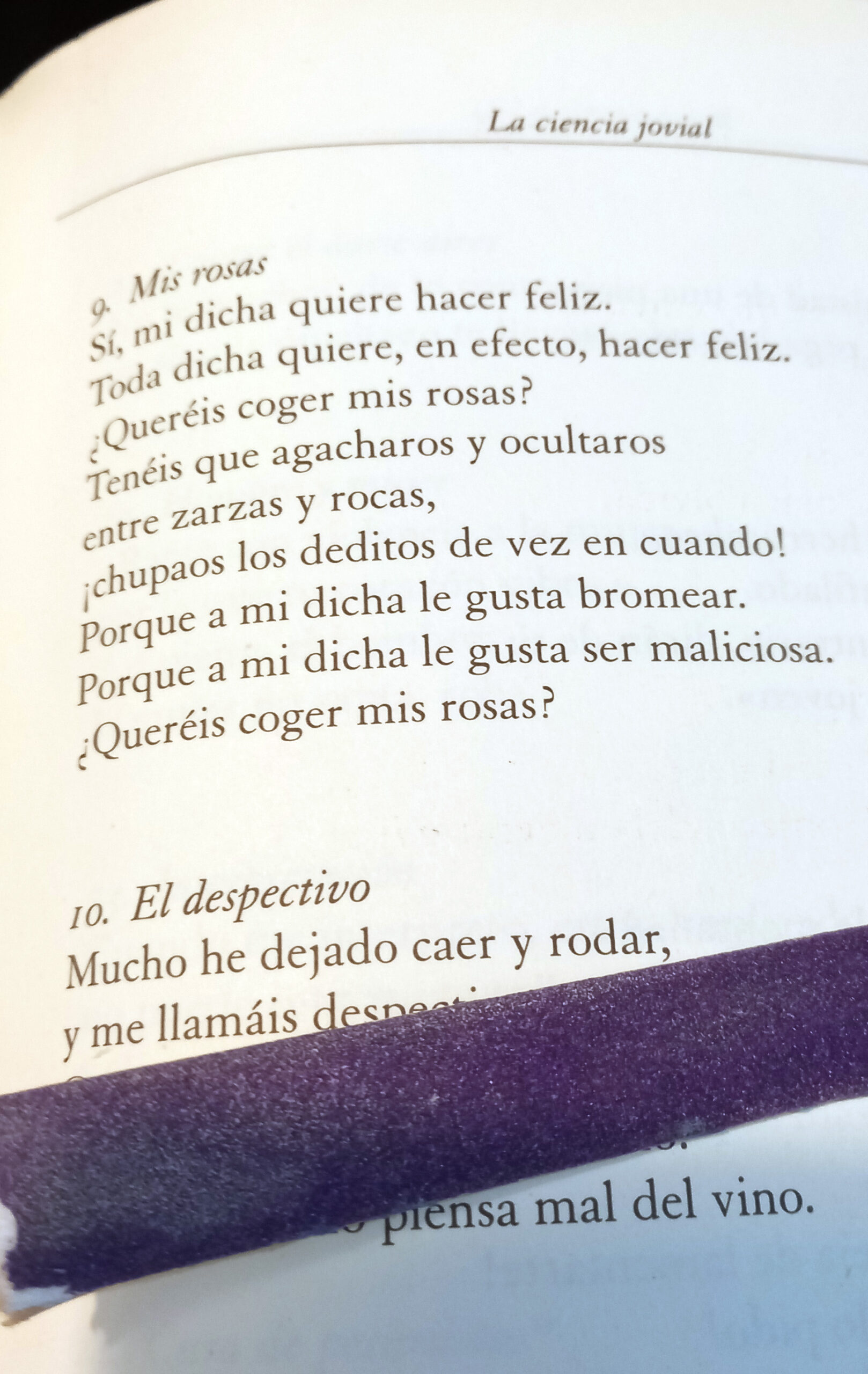Lo fascinante de comprar libros usados es que nunca sabés qué van a traerte de regalo. Este libro de Nietzsche que compré en la Librería Kafka (en Corrientes y 9 de Julio) traía dos regalos entre las páginas: Un dibujo marcando el Capítulo 5 de El nacimiento de la tragedia; y lo mejor: Una lima de uñas —bastante usada— marcando el poema 9 de La Gaya scienza.